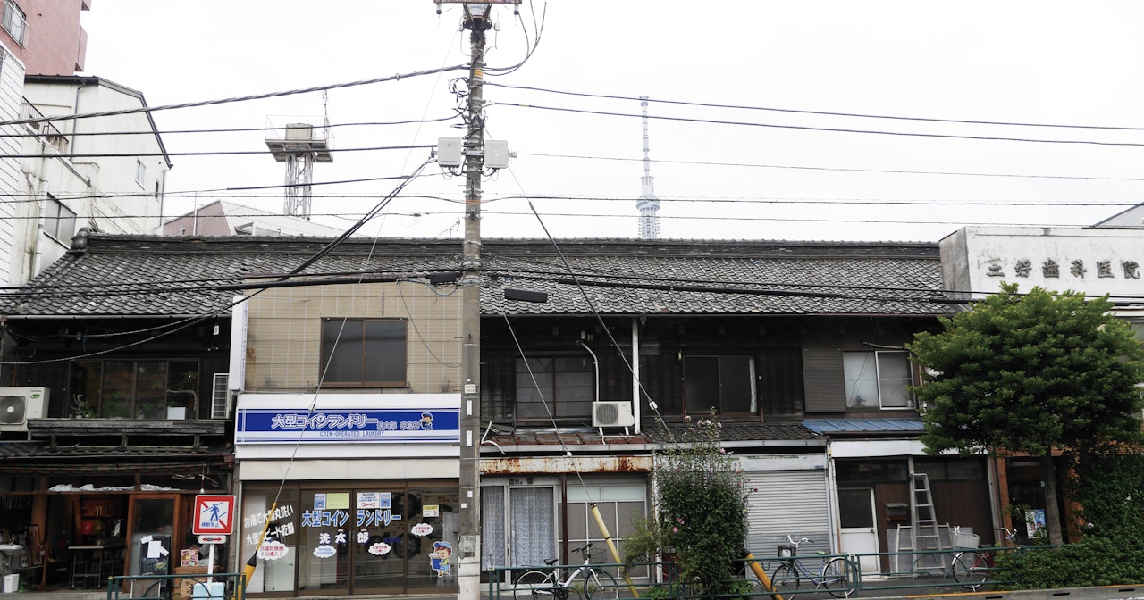 江戸時代の出桁造りを継承し戦前の屋根瓦も立派な長屋。右端の歯医者は見本のような看板建築で、あたかもコンクリート造のように見える。左端のYOMCKと呼ばれる建物では今年5月に飲食店がスタート。遡るとsheepstudio・Gスタジオ・蜻蛉家・墨田氷屋と10年の記憶が残っている場所。