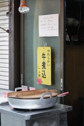 この長屋が建ったときからずっと店舗を営んでいる。昔は色々なメニューがあったそうだが、今は名物のやわらか牛煮込みのみを一年を通じて提供している。持ち帰って豆腐を入れるとなお美味しい。