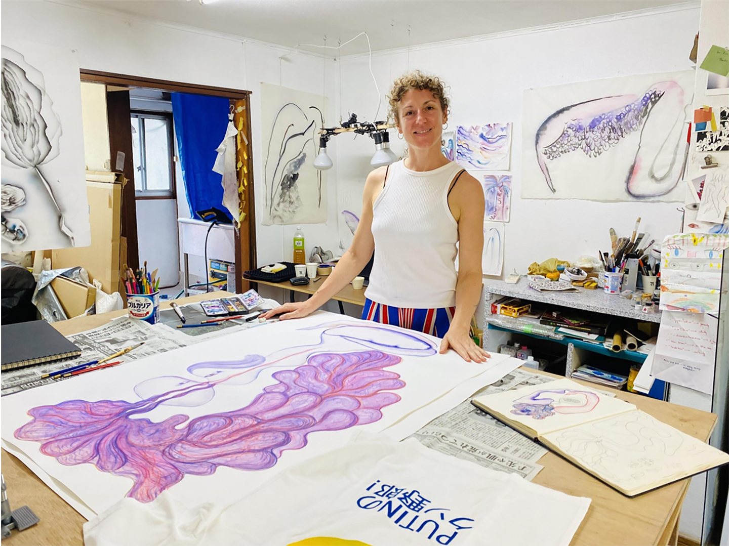 UNTITLEDの2階にスタジオを構え、日常的な経験、神話、詩、思索的な物語、世界の無形のつながりから芸術活動のインスピレーションを得ようとしているエヴェリナが、最新の作品や制作中の作品の一部を展示。