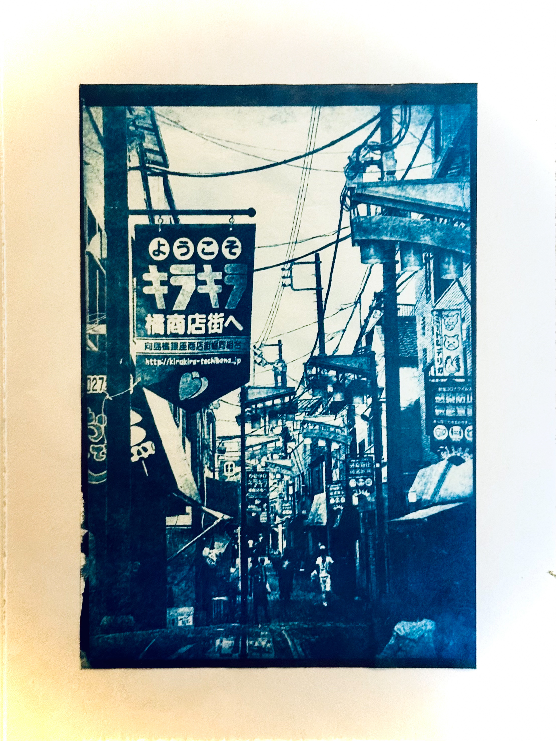 『向島EXPO 6』 エリアにて、スマホで撮った画像データから青写真を1枚つくります。その青写真を後から来る別の来場者へ渡すことで、この地域を回遊した記憶を受け伝えるプロジェクトです。出来上がった青写真の裏面には、撮影時の感想など一言メッセージ。パスポート購入者対象の無料プログラムとなります。青写真が出来上がるまで約30分かかります。