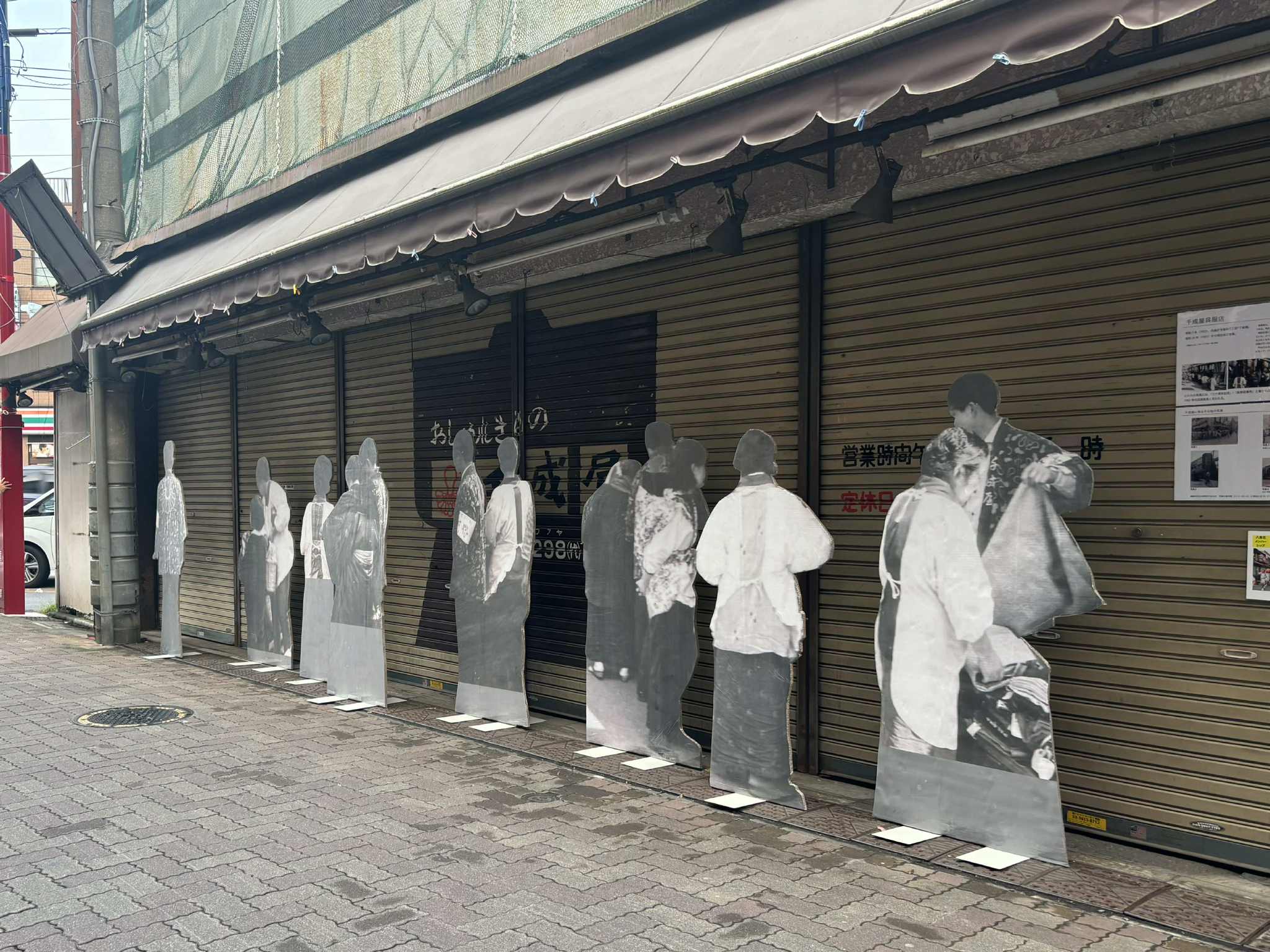 京島の少し昔の写真を素材として、まちに流れた時間や、まちの人々の記憶を再生し、共有する試みです。写真の中の人物の等身大パネルを制作するのが特徴です。引き伸ばされ、切り出された人物のイメージは身体性を帯び、当時の時間を引き寄せます。