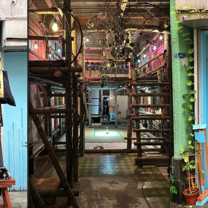 一戸一戸が三角の屋根を持つ特徴的な構造から通称“三角長屋”と呼ばれている四軒長屋。そのリノベーションして繋がった真ん中二軒のお店のこと。