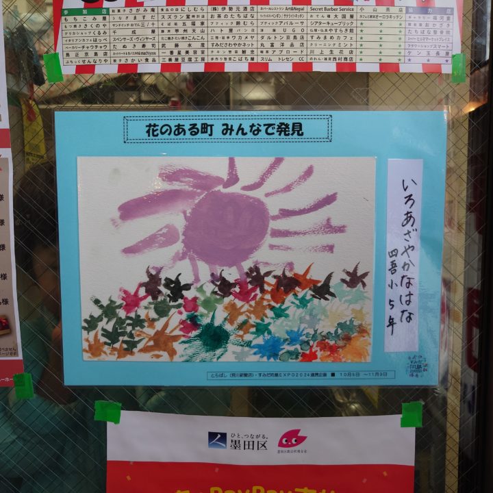 十間橋通り、文花三丁目バス停付近で飲食店を営んでいます、とらばしです。地元の人も何か企画を出して下さいと言われ、向島EXPO2回目から、近隣の子どもたちに絵を描いてもらって、その絵をキラキラ橘商店街ほか近隣のお店の店頭に飾る企画を行っています。